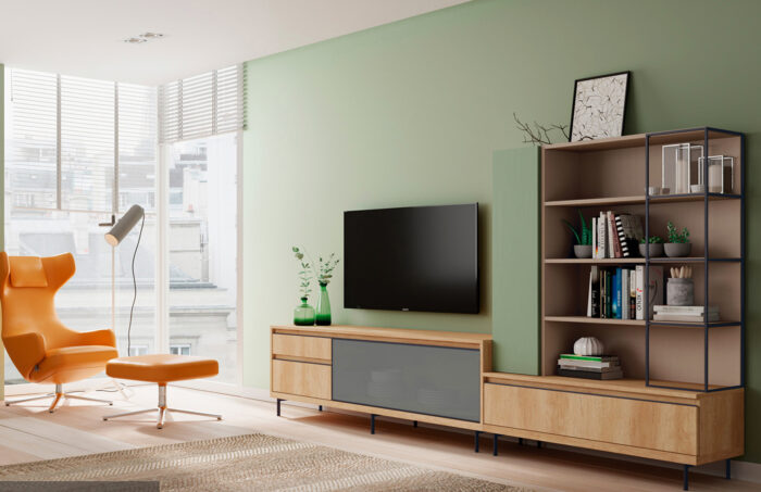 • Compuesto por módulo Tv 2 cajones, puerta abatible y 1 cajón, estantería sobre Tv.