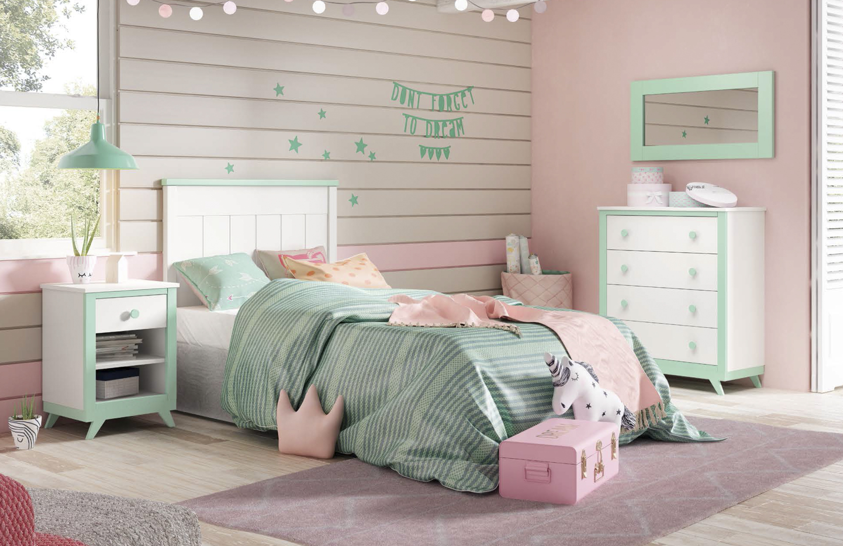 - mesita noche 1 cajón, cómoda 4 cajones con espejo y